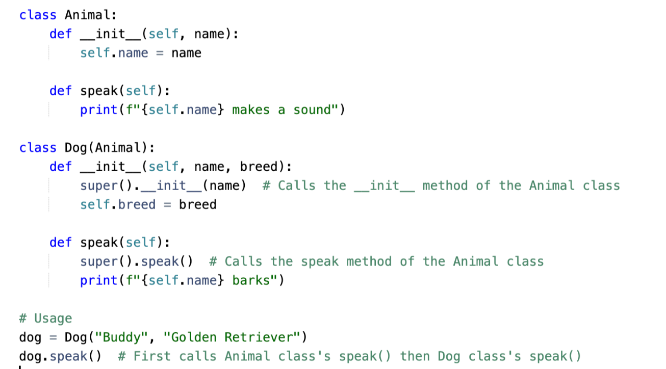 - It allows the child class to inherit all the fields (variables) and methods of the parent class.