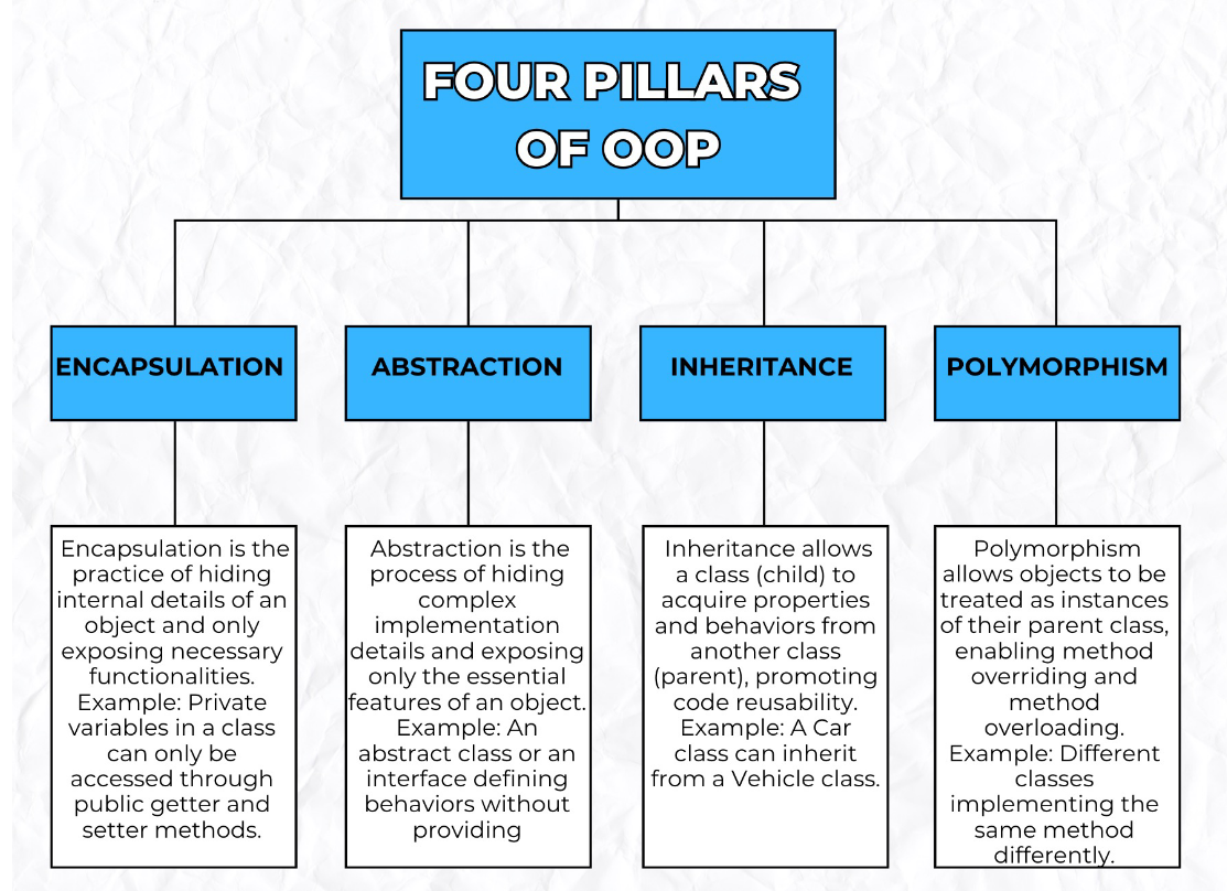 - Encapsulation - Data is protected and only accessible through defined methods.