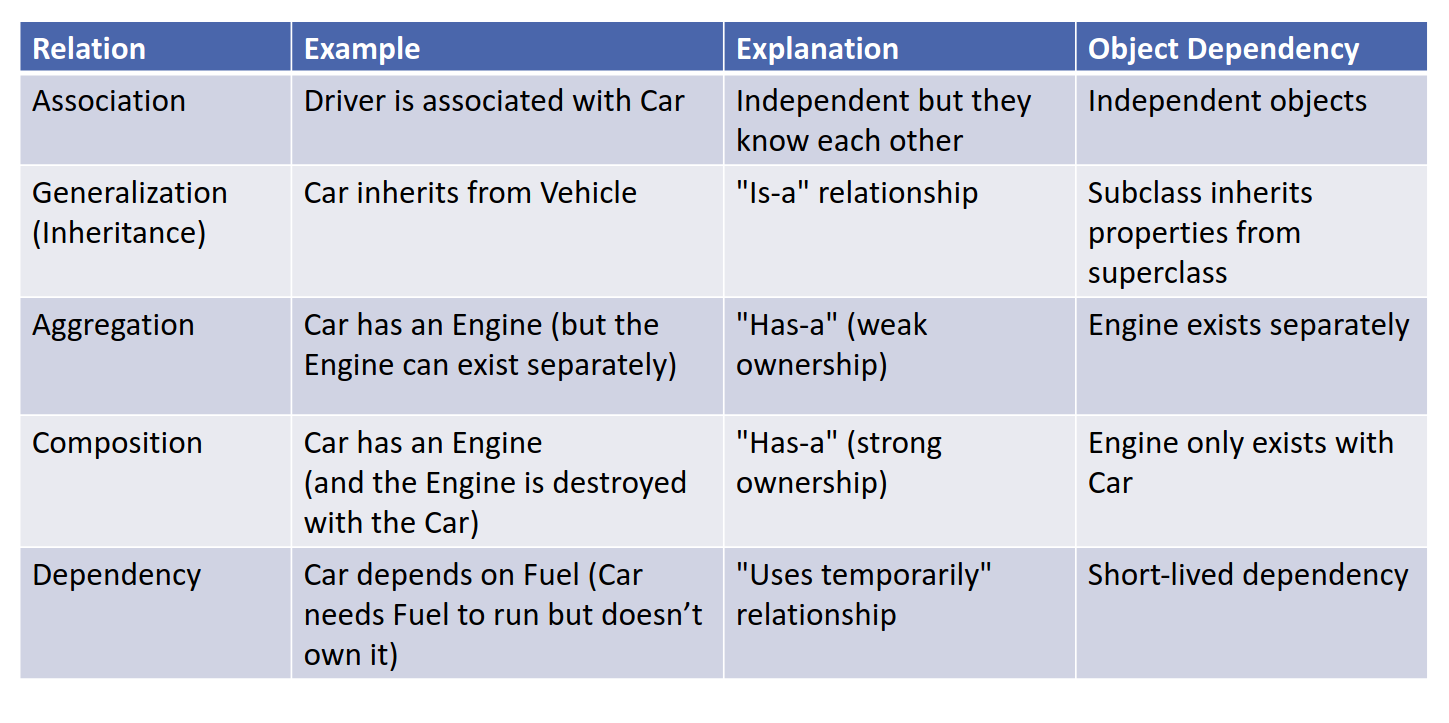 Dependency: A Car uses A FuelPump, One class temporarily depends on another.