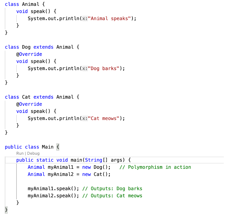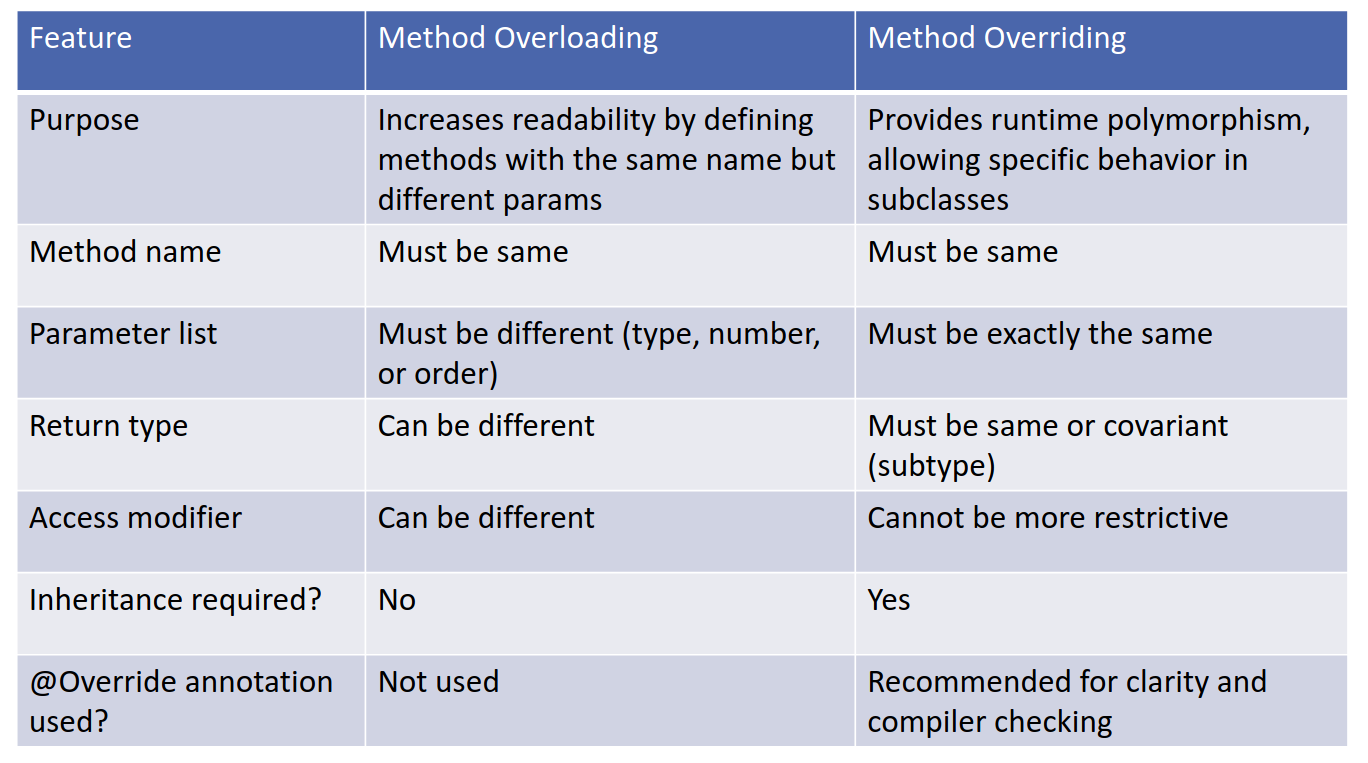 Method Overriding: • Occurs between a superclass and a subclass. • The method name and the parameter list must be the same in both the superclass and subclass. • The return type must also be the same or a subtype (covariant return type). • Overriding is resolved at runtime (dynamic polymorphism