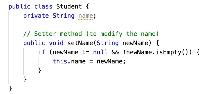 - Data Validation: setter methods allow validation checks before modifying values.
